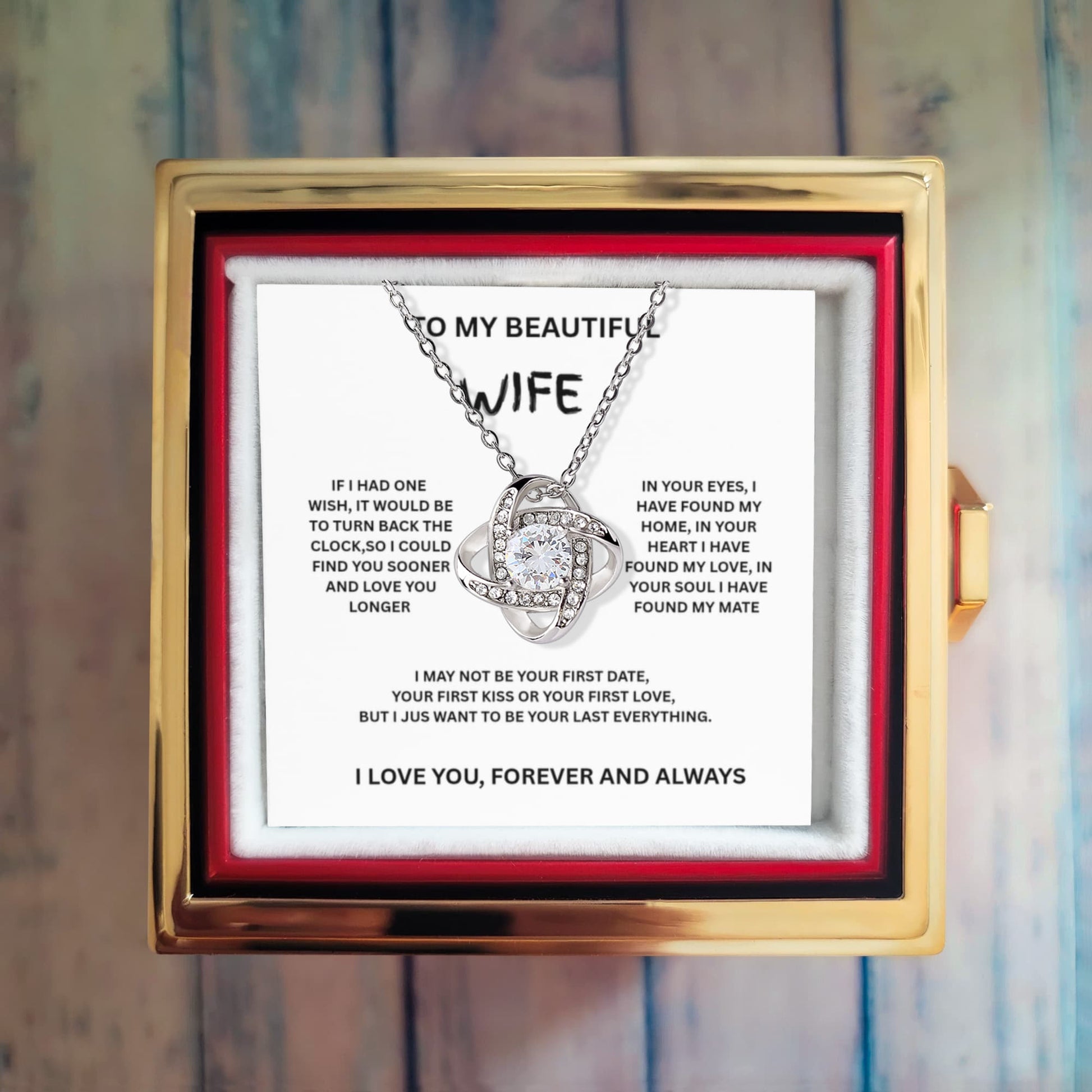 Imagine her reaction as she receives this beautiful Love Knot Necklace. Representing an unbreakable bond between two souls, this stunning pendant is adorned with premium cubic zirconia crystals, making it a timeless symbol of love and devotion. The luxurious box, featuring a meticulously preserved rose that never fades, adds an extra touch of love. With a simple turn of the gold knob, her breathtaking gift is revealedβmaking it the perfect sentimental gift for that special someone.